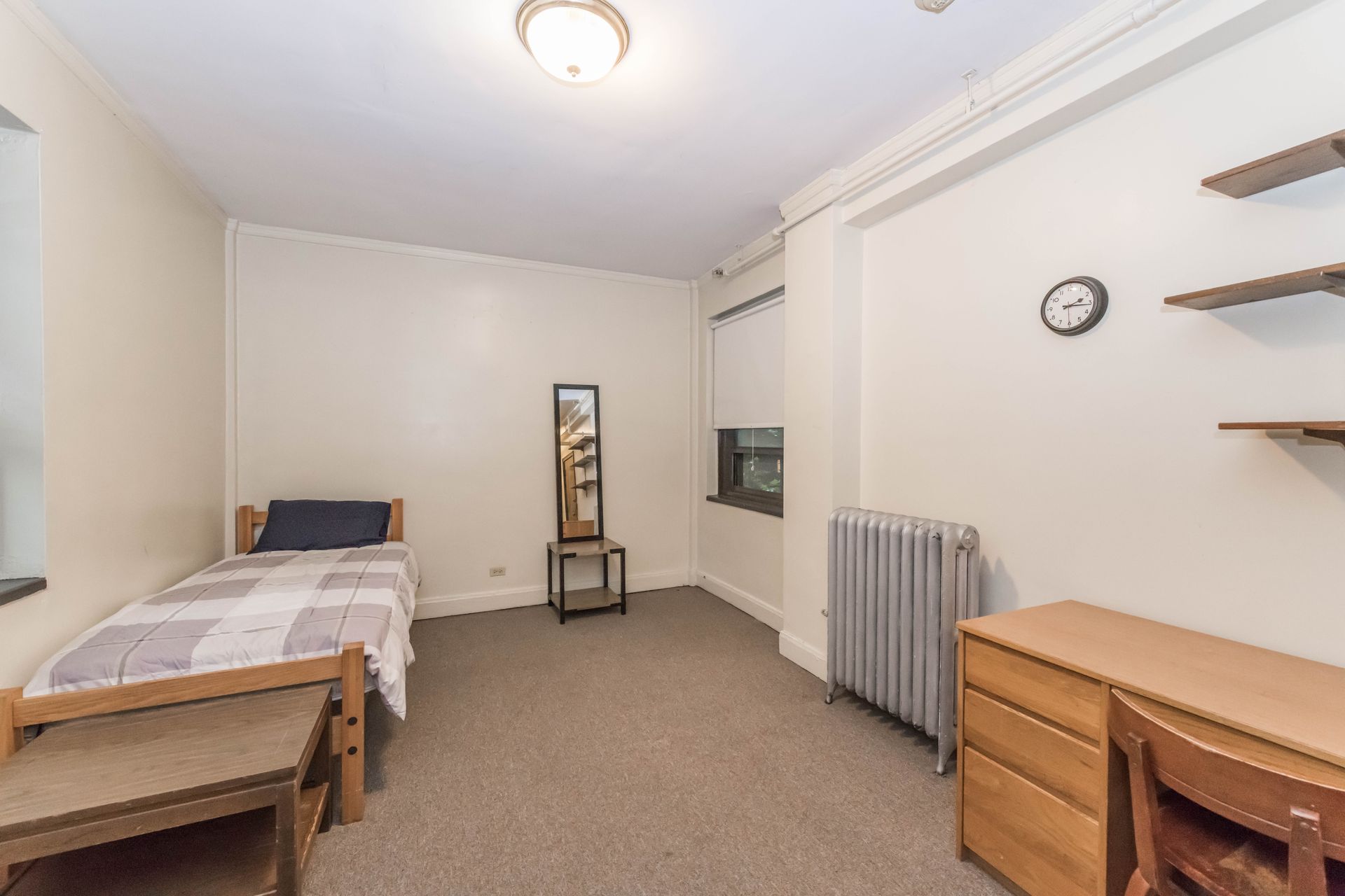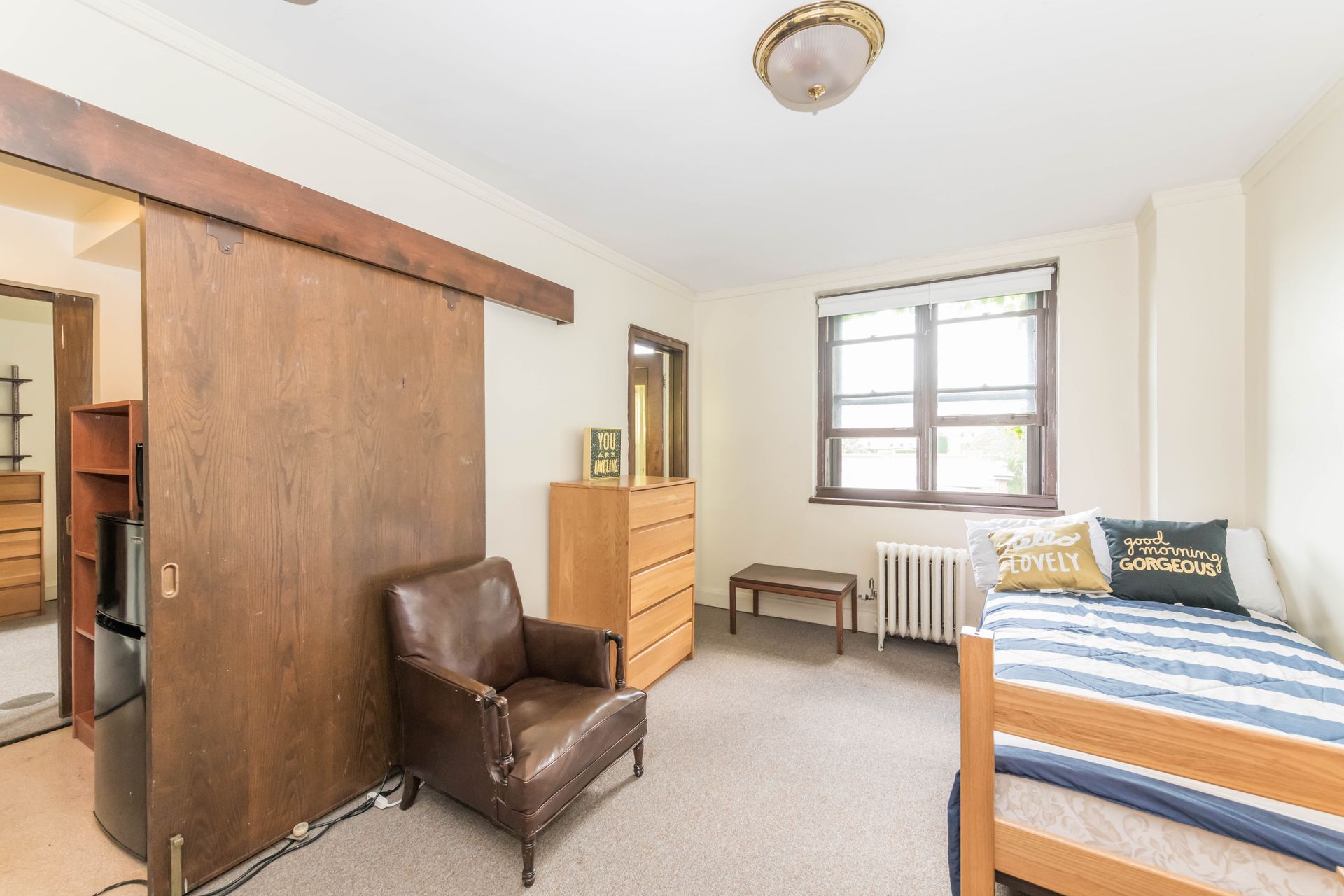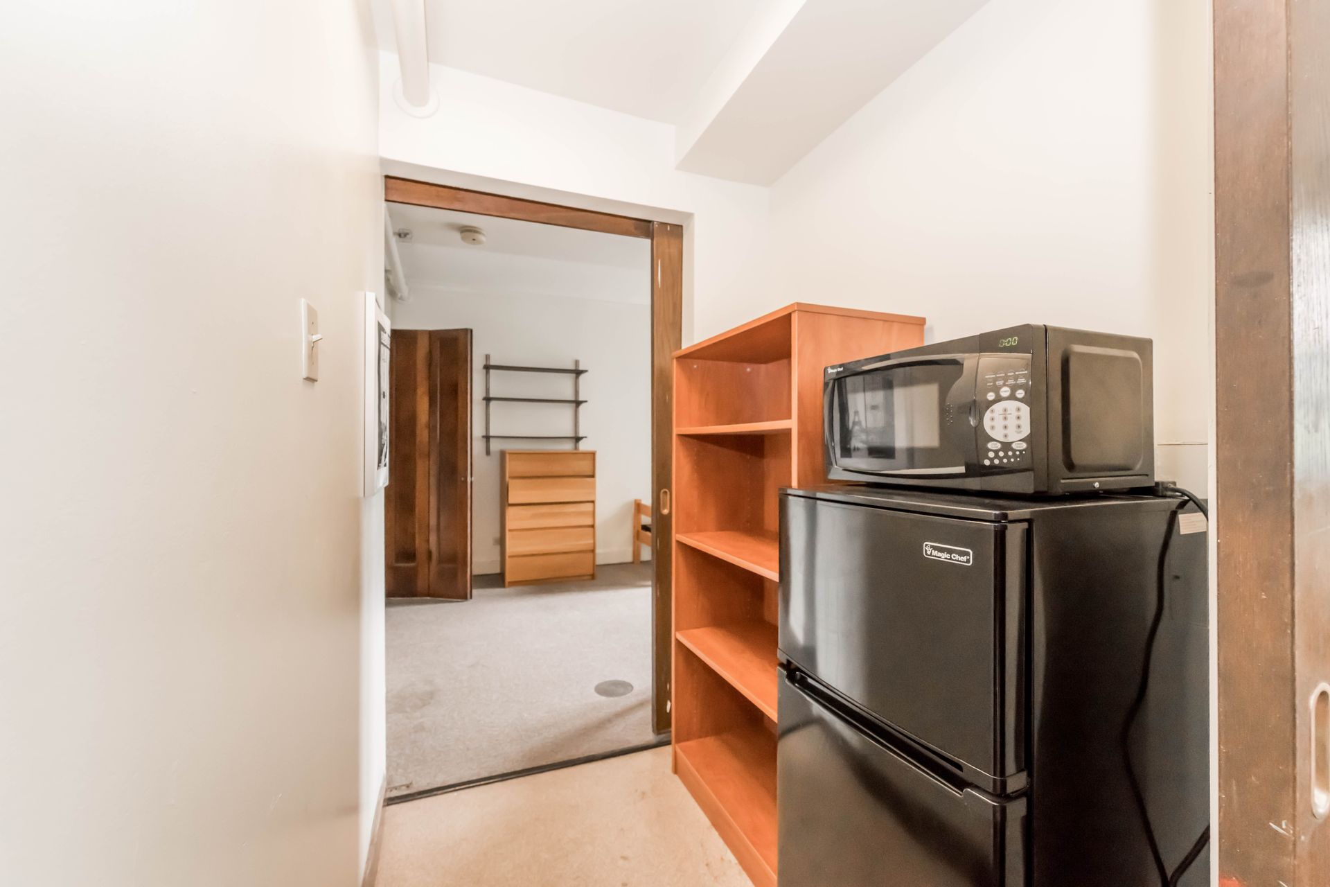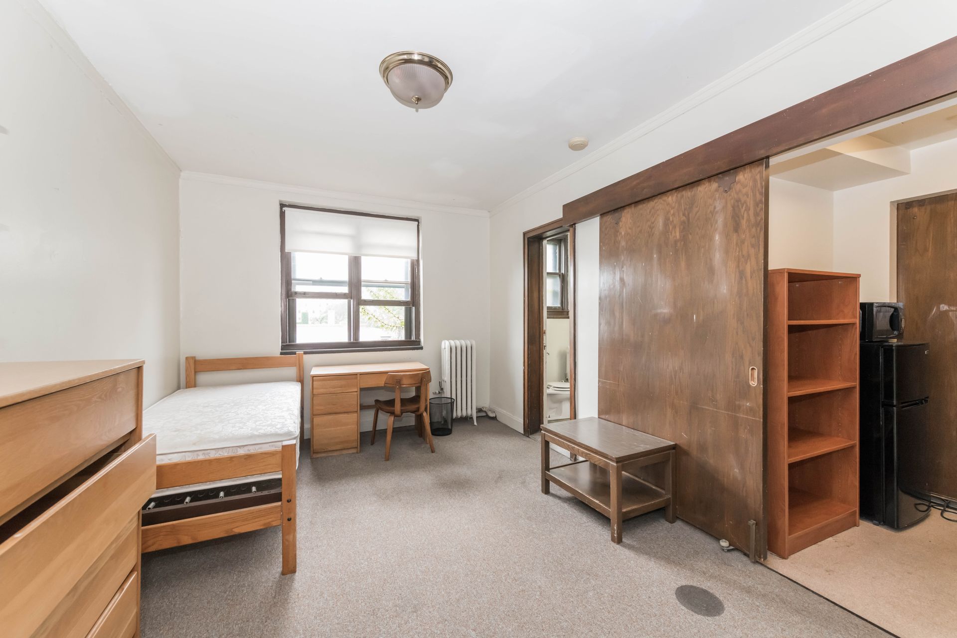 5748 S Blackstone Avenue offers vintage Jack & Jill style units, with a shared kitchenette and bathroom with one other resident – areas can be secured with locking doors on either side. The units come with optional furnishings including mini-fridge, microwave, dresser, desk and bed frame with mattress. 5748 features a study lounge and TV room, along with a full community kitchen on the ground level.